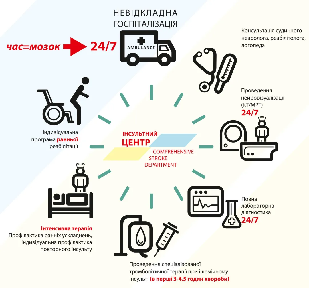 Інсульт виникає раптово і часто супроводжується значним порушенням функціонування організму – це так звана судинна катастрофа, яка завжди вимагає невідкладної допомоги. При появі перших симптомів інсульту – не зволікайте, негайно викликайте карету швидкої допомоги і наполягайте на госпіталізації в спеціалізований Інсультний центр.