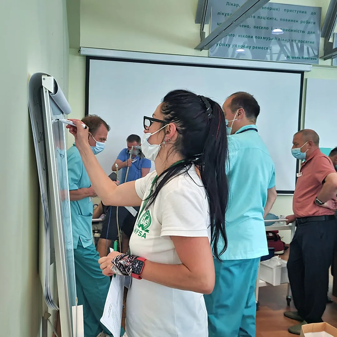 Далі учасники тренінгу працювали на 4-х симуляційних станціях. На кожній станції групи отримували різні клінічні задачі - і медики мали “врятувати пацієнта” за умов, наближених до реальності.