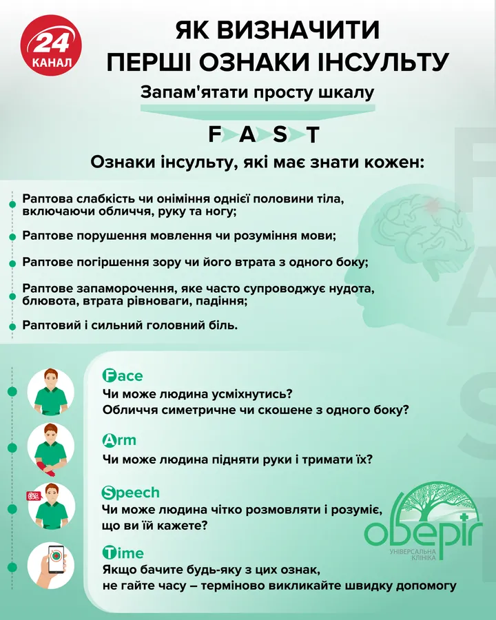 Для того, щоб визначити перші ознаки інсульту, треба використовувати просту шкалу – абревіатура FAST (Face – Arm – Speech – Time, тобто Обличчя – Рука – Мова – Час).