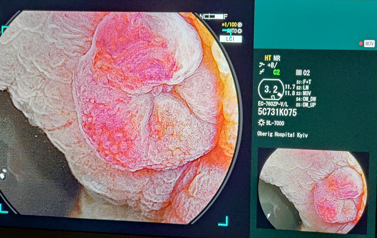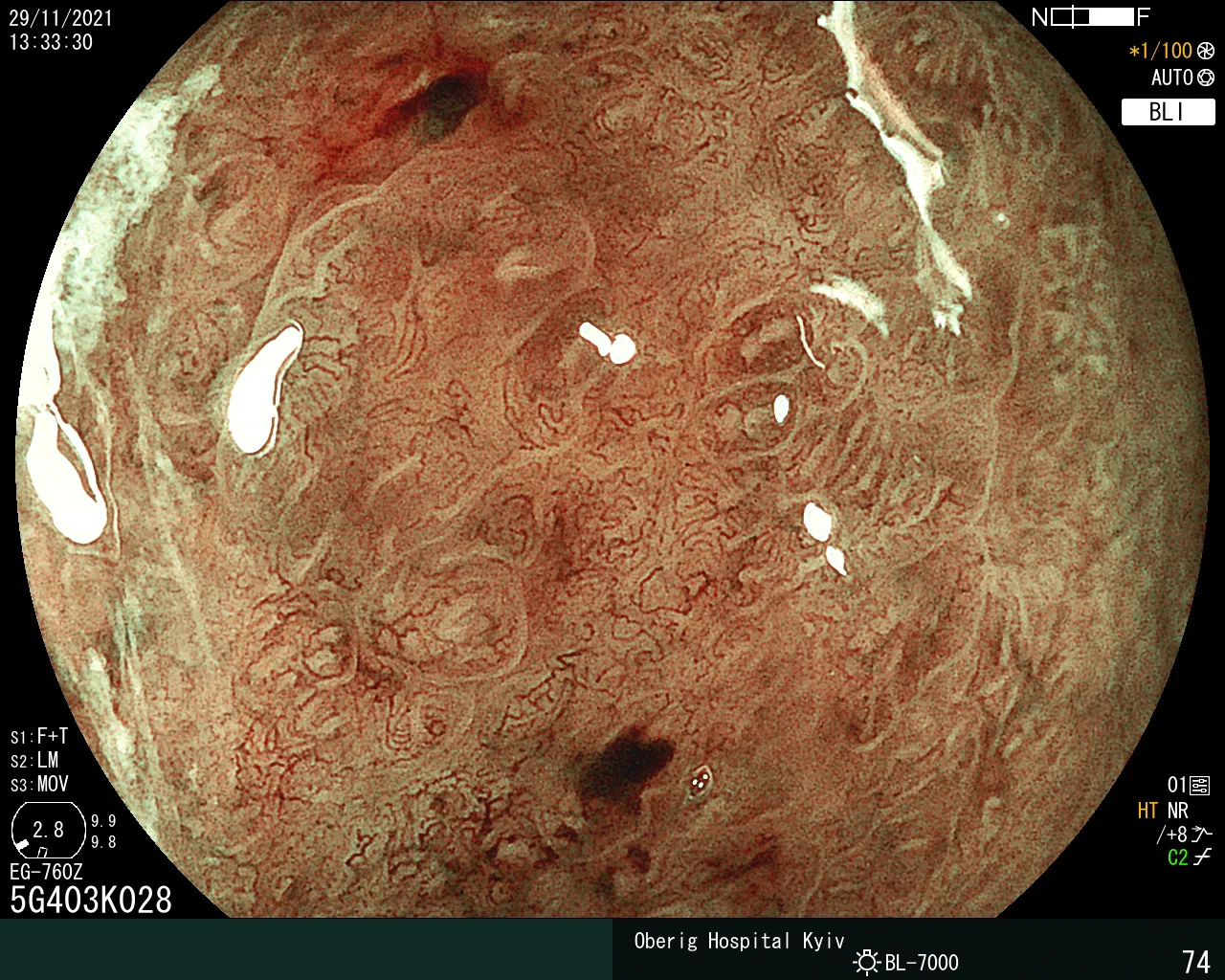 Відеоендоскопічні дослідження проводилися на найсучаснішому, найпередовішому у світі апараті для проведення гастро- та колоноскопій японському FUJIFILM, обладнаному блоком штучного інтелекту ¬– процесором і комплектом спеціальних програм для розпізнавання патологічних змін. Цікаво те, що ділянка патологічних змін у шлунку ймовірніше є ознакою раку ранньої стадії, коли пацієнт не має ані скарг, ані навіть підозри на можливість існування в організмі прихованої катастрофи. Такі випадки трапляються вкрай рідко, коли виявити рак шлунку можна на початковій стадії, і це велика удача з огляду на прогноз щодо подальшого життя. Більш того, зазвичай в однієї людини два незалежних, не пов’язаних між собою види раку — ситуація неординарна. Ми дуже раді, що нам вдалося вчасно виявити небезпечні зміни в слизовій оболонці шлунку та скоординувати пацієнта на подальше лікування до лікарів-онкологів клініки «Оберіг».