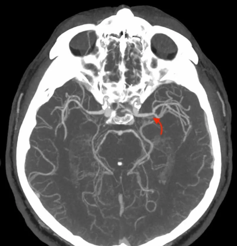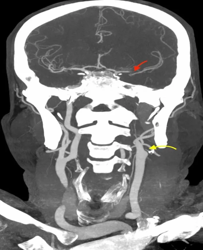 Рисунок 10. Результати повторної МСКТ-ангіографії пацієнта Д. Результати дослідження екстра- та інтракраніальних артерій продемонстрували відновлену прохідність (функціонуючий стент) проксимальної частини лівої ВСА (жовта стрілка) та нормальний просвіт лівої СМА в сегменті М1 (червона стрілка). | |