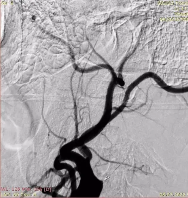 Для анестезіологічного забезпечення механічної тромбектомії застосовували седацію зі збереженням свідомості із забезпеченням кисневої підтримки через маску – 4 л/хв. АТ при ініціальному вимірюванні дорівнював 183/95 мм рт.ст. та не знижувався до моменту реперфузії басейну СМА. Час від початку захворювання до пункції стегнової артерії в ендоваскулярній операційній – 1255 хвилин. Оскільки дані МСКТ – ангіографії вказували на тандемну оклюзію (устя лівої ВСА та сегменту М1 лівої СМА) та демонстрували хорошу колатеральну компенсацію басейну лівої СМА, трансфеморальним доступом операційним провідниковим катетером відразу була проведена катетеризація лівої загальної сонної артерії без етапу діагностичної ангіографії. Цифрова субтракційна ангіографія дозволила з’ясувати місце відходження лівої ВСА від загальної сонної артерії та за допомогою балонного катетера для черезшкірної ангіопластики (percutaneous transluminal angioplasty balloon catheter) сформувати канал на рівні тромбованої атеросклеротичної бляшки ВСА (рис. 4) з метою проведення за межі оклюзії у дистальному напрямку операційного провідникового катетера.