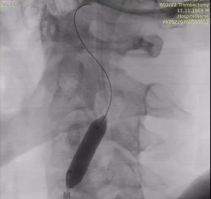 Після розкриття стент-ретривера на рівні тромбозу СМА кінчик аспіраційного катетера при постійній аспірації за допомогою помпи провели безпосередньо до місця оклюзії та виконали тромбектомію технікою SAVE (stent retriever-assisted vacuum-locked extraction) (рис. 6).