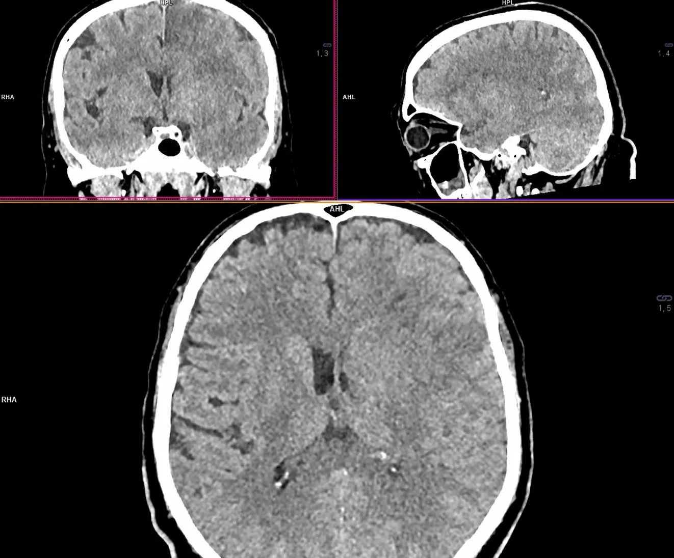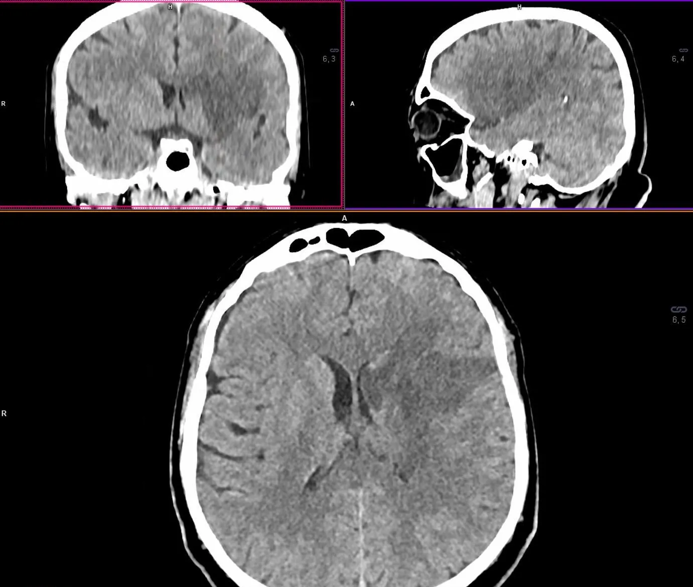 На момент прибуття до клініки «Оберіг» (13:45) пацієнт був відразу доправлений у кабінет КТ, де він був оглянутий лікарем-невропатологом Ю. В. Фломіним. На момент первинного огляду у пацієнта була клінічна картина дуже тяжкого мозкового інсульту (загальна оцінка за NIHSS=23 бали). Вітальні функції без критичних відхилень: АТ 172/91 мм рт.ст., ЧСС 84 за хв., ЧДР 16 за хв., SpO2 97% (атмосферне повітря), температура тіла 36,4⁰С, рівень глюкози крові 9,6 ммоль/л. Результати первинної нейровізуалізації представлені на рис. 1-3.