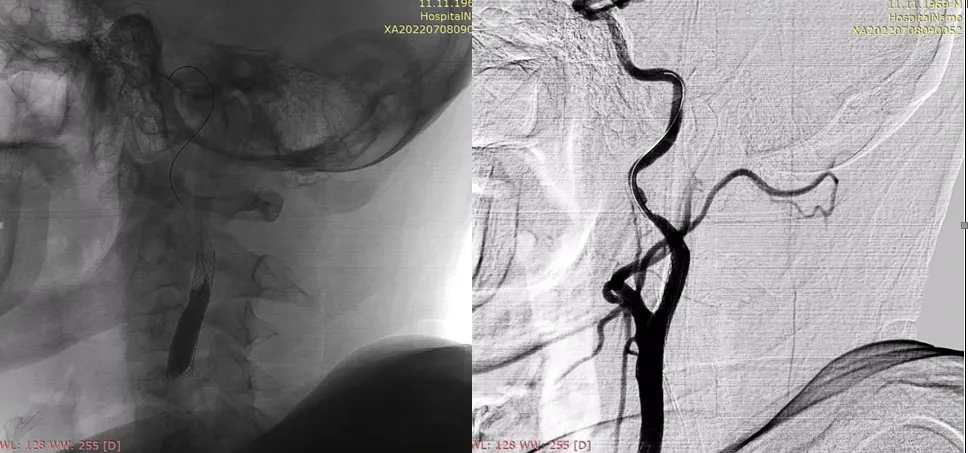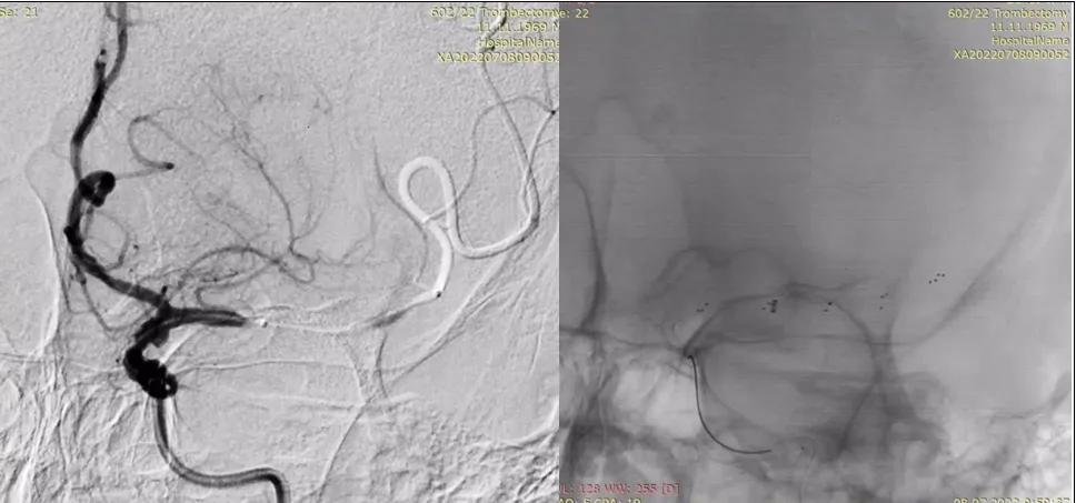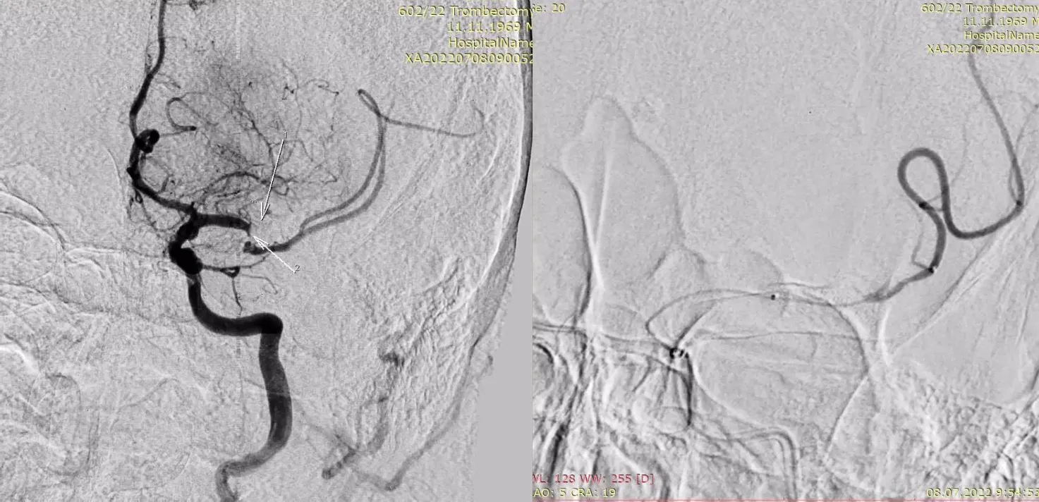 Результати мультипраметричної МСКТ продемонстрували, що пацієнт мав великий об’єм пенумбри і відповідав критеріям відбору для ендоваскулярного лікування в проміжку між 6 та 24 годинами від початку захворювання, що ґрунтуються на клінічному випробуванні DAWN, зокрема мав загальну оцінку за NIHSS ≥10 балів, відсутність обмежень життєдіяльності до інсульту, розміри інфаркту мозку <1/3 басейну СМА, оклюзію ВСА та клініко-нейровізуалізаційну невідповідність (загальну оцінку за NIHSS ≥20 балів при об’ємі ядра інфаркту <51 см3). Отримавши інформацію від лікаря-радіолога клініки «Оберіг» М. М. Ковратка, завідувач Інсультного центру клініки «Оберіг» Ю. В. Фломін відразу зв’язався з своїм постійним партнером С. В. Конотопчиком, який працює у НПЦ Ендоваскулярної нейрорентгенохірургії (директор – проф. Д. В. Щеглов) – провідному закладі України в галузі ендоваскулярних операцій у пацієнтів з гострим інсультом. Досвідчений колега відразу зрозумів, що є можливість врятувати значну частину мозку пацієнта, і майстерно провів необхідне хірургічне втручання, яке виявилося результативним як з огляду на зменшення ураження мозку, так і щодо зменшення тяжкості неврологічного дефіциту, обумовленого інсультом. У подальшому, завдяки зусиллям мультидисціплінарної команди Інсультного центру, ці досягнення були перетворені у досить швидке відновлення пацієнта.
