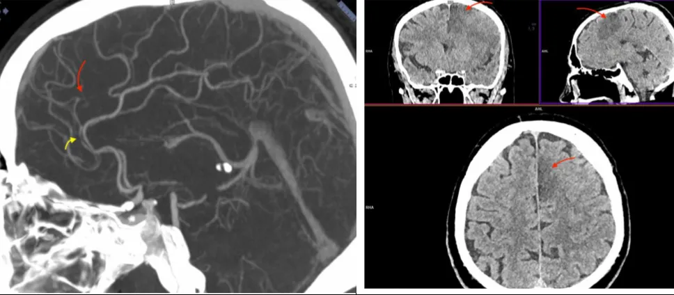 Рисунок 11. Ознаки стенозу лівої передньої мозкової артерії та інфаркту в її басейні, яких не було при первинній нейровізуалізації. Результати повторної МСКТ-ангіографії вказують на стенозування сегменту А2 лівої передньої мозкової артерії (жовта стрілка) та оклюзію калозомаргінальної артерії (червона стрілка). Результати повторної МСКТ голови продемонстрували нове вогнище інфаркту (червона стрілка) в парасагітальних відділах лівої лобної частки (басейн лівої передньої мозкової артерії). |