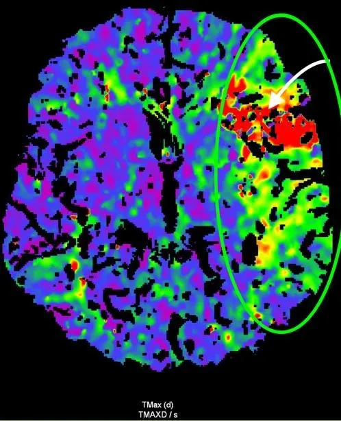 Відповідно до результатів нейровізуалізації та візуалізації церебральних артерій у пацієнта Д. був діагностований ішемічний інсульт, що обумовлений оклюзією великої мозкової артерії (лівої внутрішньої сонної артерії [ВСА] та лівої середньої мозкової артерії [СМА]). Згідно з результатами автоматичного обчислення, на момент дослідження об’єм ядра інфаркту у пацієнта Д. склав 24,6 см3, а об’єм зони пенумбри – 47,9 см3. Отже, об’єм зони пенумбри становив 194,7% об’єму ядра (співвідношення пенумбри та інфаркта майже 2:1). Зважаючи на це, ситуація була обговорена з лікарем-нейрохірургом С. В. Конотопчиком і о 14:45 пацієнт бригадою НМД «Оберіг» був доправлений у ДУ «НПЦ Ендоваскулярної нейрорентгенохірургії НАМН України» та спрямований одразу до операційної.