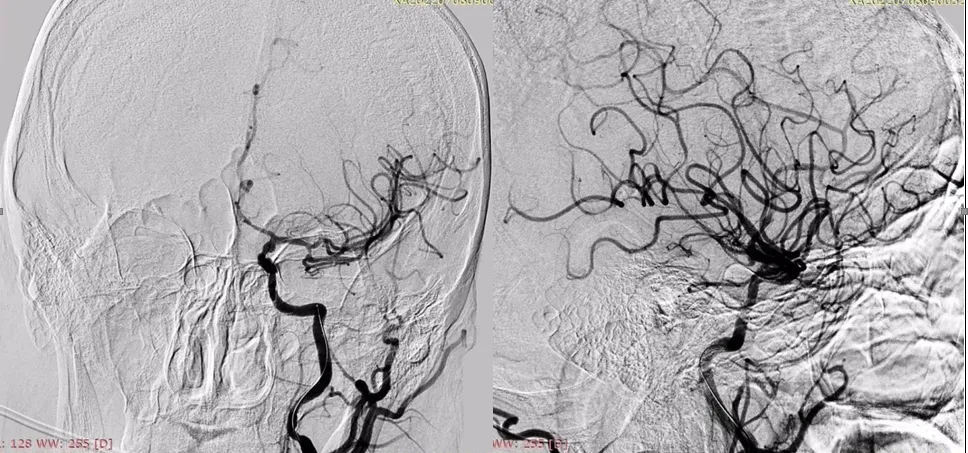 Рисунок 7. Цифрова субтракційна ангіографія, лівий каротидний басейн, передньо-задня та бокова проекції демонструють майже повну реперфузію басейну лівої СМА (eTICI 2c). |