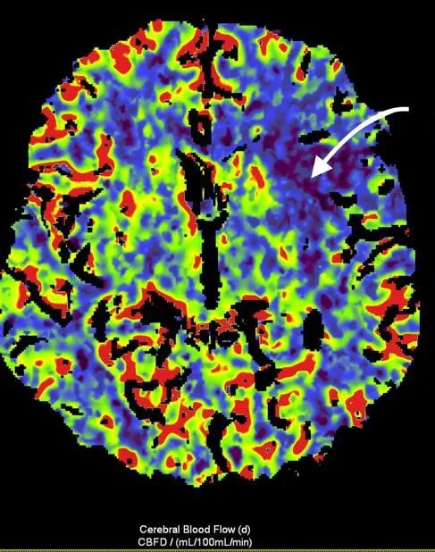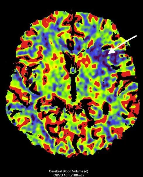 Рисунок 3. МСКТ-перфузійні зображення пацієнта Д. Представлені карти МСКТ-перфузійних зображень демонструють зони дуже низької перфузії при CBV (a) та CBF (b), що відповідають ядру інфаркту (біла стрілка), та велику зону, що відповідаї пенумбрі (зелений овал) при TMax-map (c). | ||